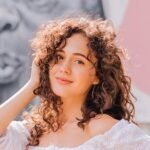 Portrait of a young woman elegantly wrapped in flowing pink fabric, exuding grace and calm.