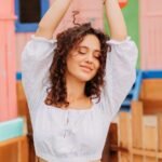 A vibrant coffee cup with floral design held in front of a pink door adds a pop of color.